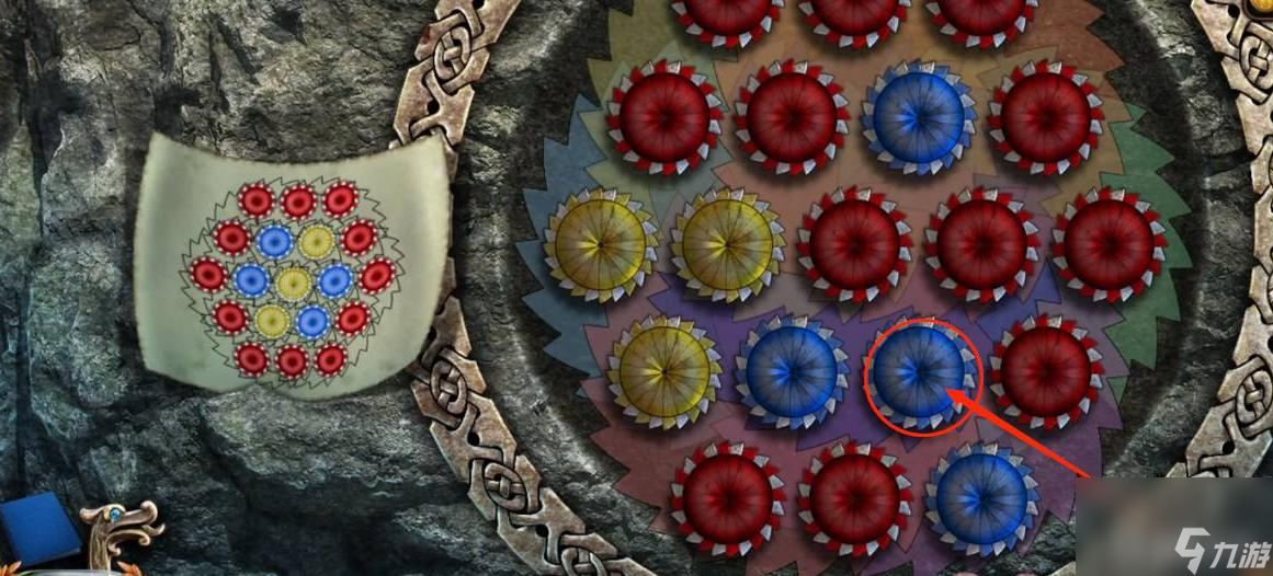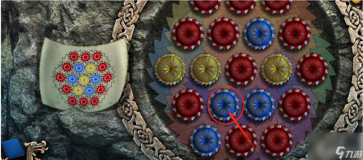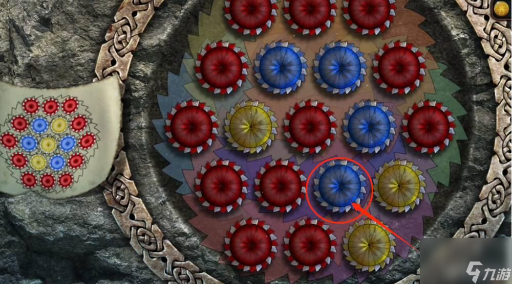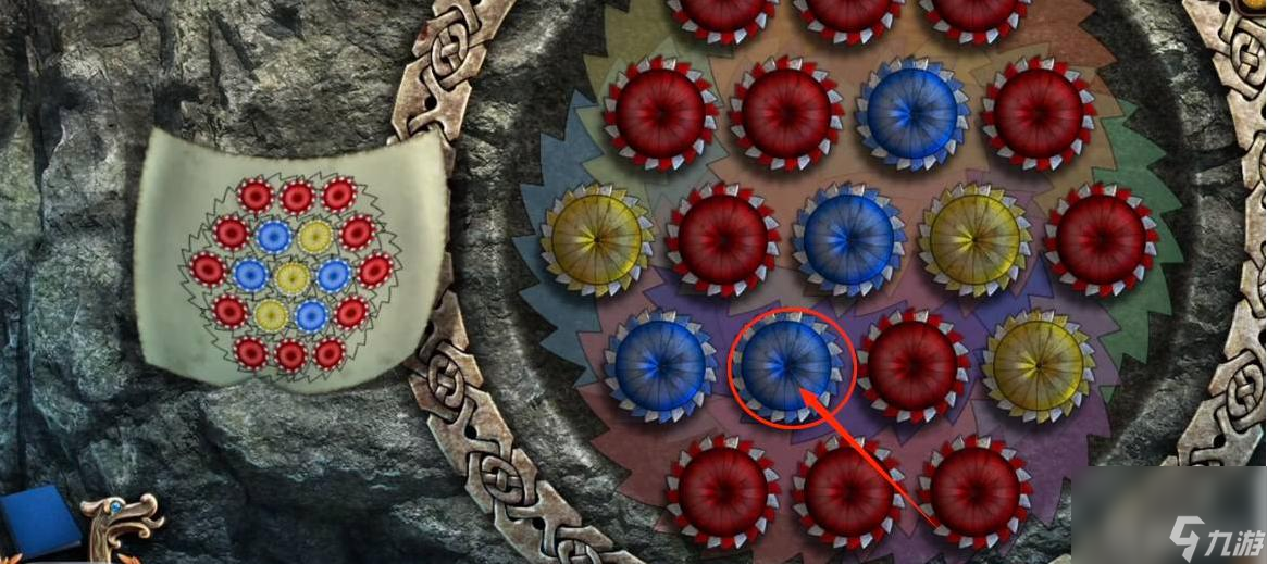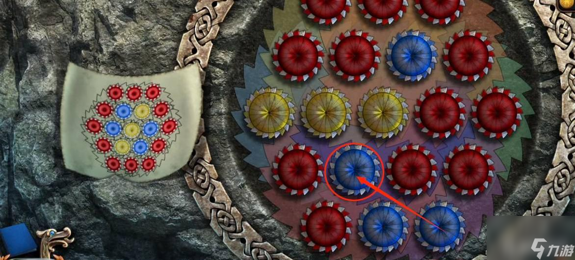 点击二下第四排的第二个蓝色齿轮,该蓝色齿轮周围的六个齿轮会随之顺时针旋转两个位置。