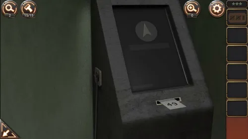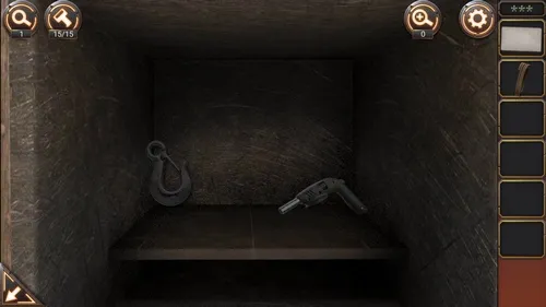 调查左下角的箱子,放上木牌根据木牌的提示得出密码为8和5。上方数字选择8,下方数字选择5,然后点击把手打开箱子,得到喷枪和钩子。