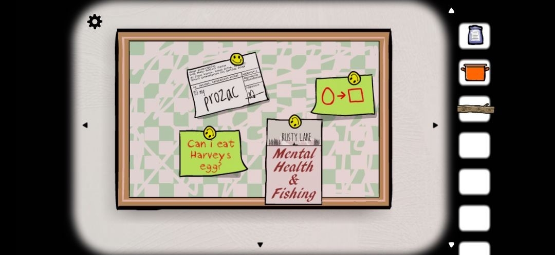 百忧解10毫克(一种精神药物”、精神健康钓鱼中心的传单,用哈维之蛋换取方块的提示。
