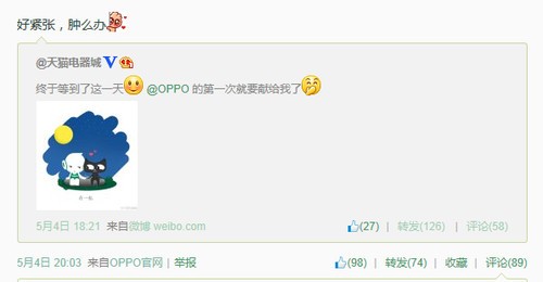 5月4日傍晚,天猫电器城新浪官微发布了一条内容为“终于等到了这一天,OPPO的第一次就要献给我了”的微博,同时配以一张题为“在一起”的图片。上面是经典的OPPO卡通人物与天猫经典形象黑猫的形象,充满遐想空间。而两小时后OPPO新浪官微予以回复“好紧张,肿么办”更是引起了网友的广泛讨论。,而今天,谜底终于揭开。