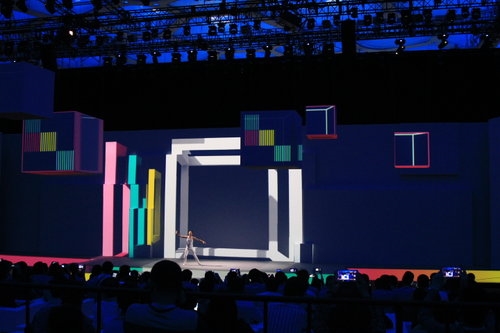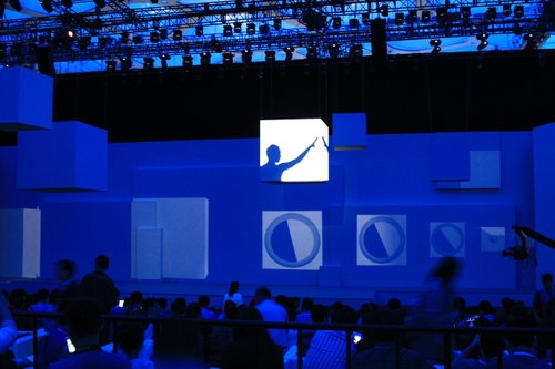 舞台部分从布置看来,有很明显的立体风格。之前曾有传闻该发布会或许会采用3D技术,观众也许会带上3D眼镜来观赏。