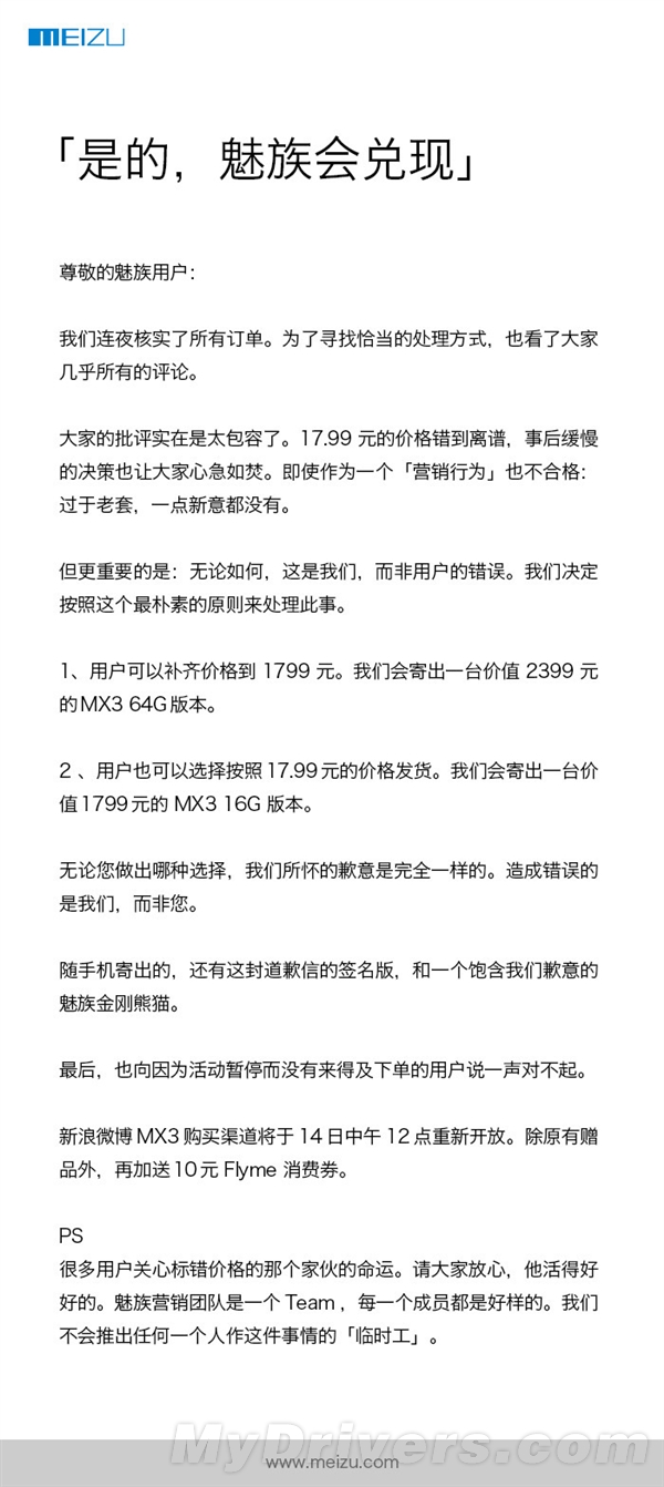 魅族表示,无论如何都是自己的错,而非用户的错,所以无论用户做出哪种选择,所怀的歉意是完全一样的,所以决定按照最朴素的原则来处理此事: