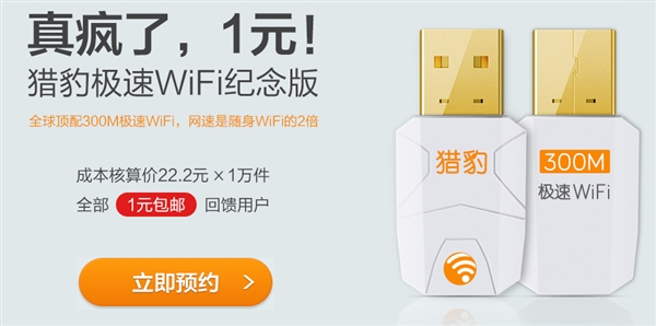 猎豹移动1元神器“猎豹极速WiFi”今天正式发布,帮助用户解决没有无线网卡的问题,让台式机也能连WiFi。猎豹极速WiFi纪念版5月21日正式开售,前10000件仅售1元,还包邮。