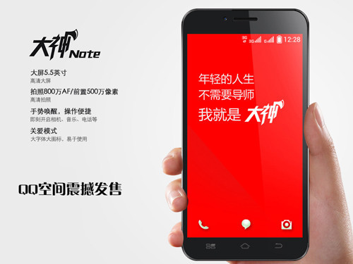 据悉,酷派大神Note采用联发科四核心处理器,配备了5.5英寸屏幕,运行基于android深度二次开发的时尚清新的Cool UI 5.5;前置摄像头500万像素,后置摄像头800万像素;支持双卡双待,可使用移动2G/3G和联通2G网络,新增首饰唤醒,关爱模式等功能。作为一款电商产品,酷派大神note采用了非常OPEN的销售策略,在QQ空间独家首发,借助于庞大QQ空间用户群体,酷派大神note或将成为新一代电商明星机型。