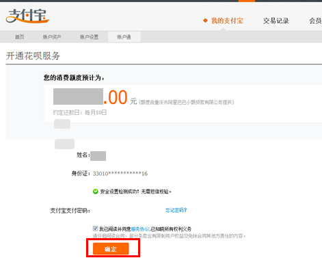 2、填写信息(服务协议默认勾选),输入支付密码点击【确定】;