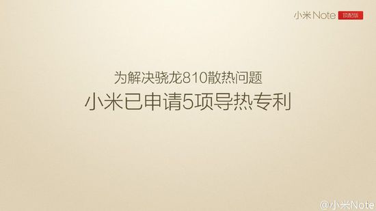 小米声称,为了解决骁龙810过热的问题,申请了5项导热专利,具体是什么专利不太清楚。根据小米PPT上播放的,小米对机身散热进行了优化,包括:“优化机身框架结构,整机散热更均匀;CPU导热工艺,提升热传导效率;4张石墨散热片,内含1张双层散热片”。