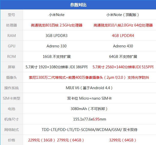 骁龙810的八核64位架构包括四个Cortex-A57和四个Cortex-A53,其中Cortex-A57架构处理核心相比上一代Cortex-A15构架提升高达1.9倍。其Adreno 430图形处理器比上代图形处理器性能提升80%,功耗降低50%。小米本着对产品极致的追求,与高通团队密切合作,经历了数月反复的优化之后,小米Note顶配版终于问世。