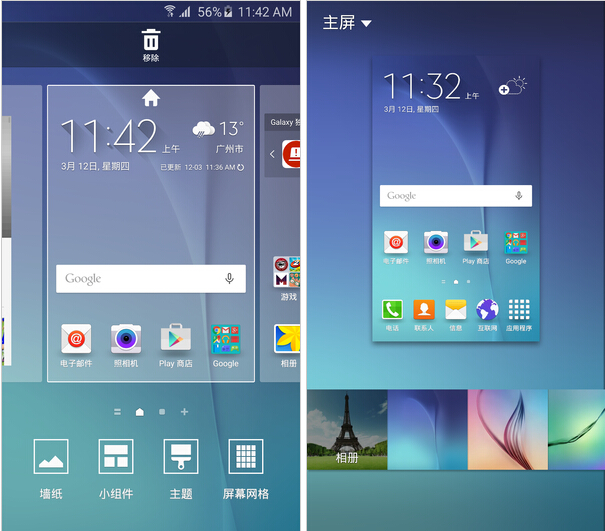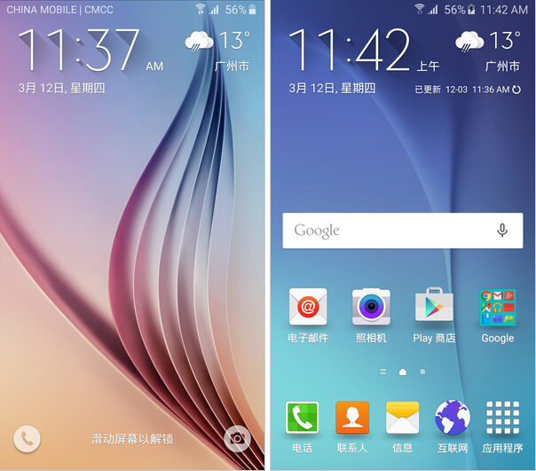 与往年一样,Galaxy S6上依然采用的是自家的TouchWiz定制系统,定制版本基于Android 5.0.2。不知三星是受了iPhone 6大屏的刺激,还是确实想扭转大众对TouchWiz的印象,今年的TouchWiz明显好看清爽了许多。三星本来就有将TouchWiz“去臃肿化”的意思,在加上去年谷歌发布Material Design设计规范为安卓系统提供了有效的界面及交互参考,所以Galaxy S6上的TouchWiz才算是重生了一遍。