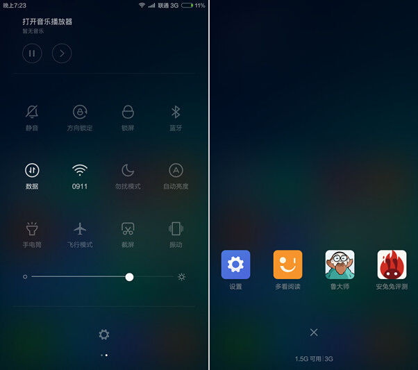 在系统过度页面的渲染上,MIUI V6加入了更多的毛玻璃效果,比如下拉通知栏、关机界面、文件夹页面和多任务栏等等。另外,MIUI V6还能能根据应用或手机文件主色调智能变换界面色彩。而针对增大屏幕版本的小米Note,MIUI V6同样内置有单手模式,只要在触控键中心分别往左右滑动,即可唤醒单手模式。用户可自由选择4.5英寸、4英寸、3.5英寸三种小屏幕尺寸。