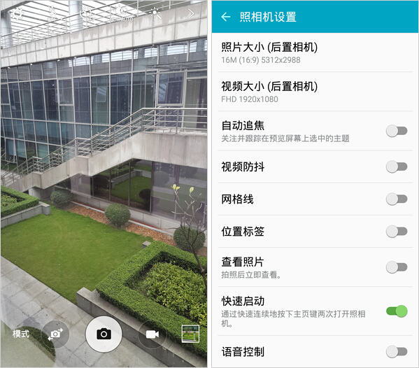 在拍照配置方面,前置摄像头为500万像素,拥有美颜功能。此次后置摄像头虽然维持在1600万像素,但是加入了相机防抖,在弱光拍摄下效果更好。实时HDR、智能OIS以及红外检测白平衡功能也能为画质提供帮助。不过比较遗憾,好像自从iPhone 6的摄像头突出后,各大旗舰也好像毫不介意了,三星S6同样也有这个问题,在现阶段光学元件体积技术的限制下,似乎这也是暂时不能解决的。要说拍照最为实用的一个方面,那便是“快速启动”(Quick Launch),可让用户在0.7秒内从任一屏幕迅速直通相机,我们只需双击home键即可实现。