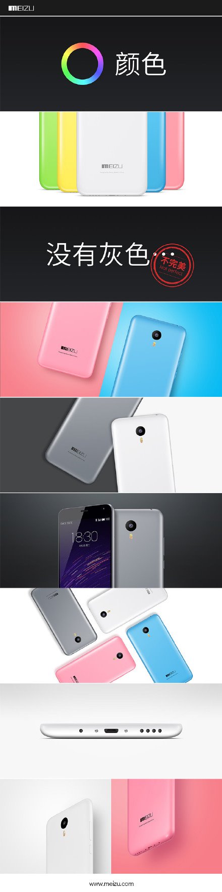[下午2:56:22] 魅蓝Note采用彩色机身,但用户有人强调竟然没有灰色,因此Note2重新调整机身配色方案,改为蓝、灰、白、粉四款,灰色版本改用了磨砂材质。