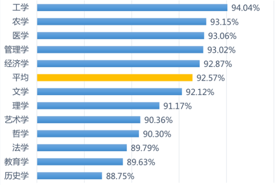 将各本科专业的就业率按学科门类汇总后可以看出,工学的本科毕业生就业率是所有门类中最高的,达94.04%;农学和医学门类的就业率也较高,分别是93.15%和93.06%;管理学和经济学是考生们热衷报考的两个门类,本科毕业生就业率都高于总体平均水平,达93.02%和92.87%;本科毕业生就业率低于总体平均水平的门类依次是文学、理学、艺术学、哲学、法学、教育学、历史学,其中法学、教育学和历史学的就业率都低于90.00%。