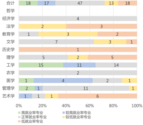 共有113个本科专业的有效样本数不少于40个(见图2)。这其中,高就业率专业有18个(占15.9%),较高就业率专业有17个(占15.0%),正常就业率专业有47个(占41.6%),较低就业率专业有13个(占11.5%),低就业率专业有18个(占15.9%)。从各个学科分类下设专业的分区结果看: