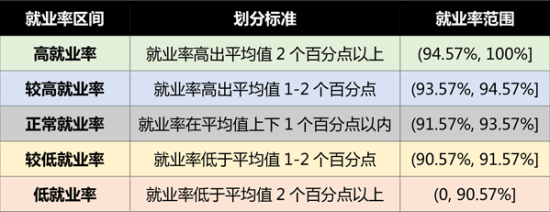 高校公布的本科毕业生分专业就业率共涉及300多个专业,针对每个专业,我们计算了所有相关学校该专业本科毕业生就业率的平均值。对于那些有效样本不少于40个的专业(即公布该专业就业率的高校数达到40所或更多),我们将其就业率由高到低划分为高就业率、较高就业率、正常就业率、较低就业率、低就业率5个区间,具体如表1所示。