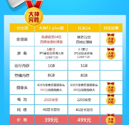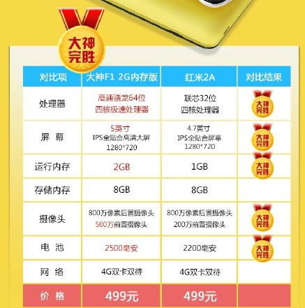 而红米2A则配备联芯32位四核处理器,4.7英寸屏幕,1GB运存,前置摄像头仅200万像素,并内置2200mAh电池,很明显,大神F1直接秒杀红米2A。