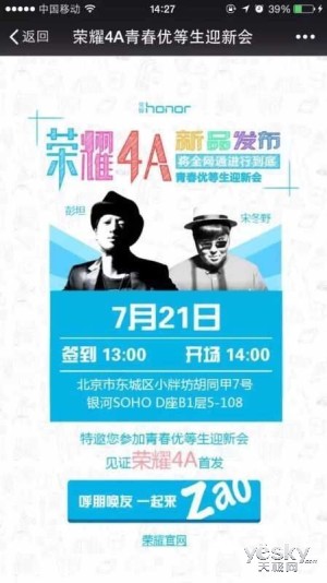 等了那么久,你终于出现。7月21日,荣耀邀您相约北京银河SOHO共同见证荣耀4A的诞生。音乐人宋冬野及彭坦乐队静候您的光临,与您不见不散!