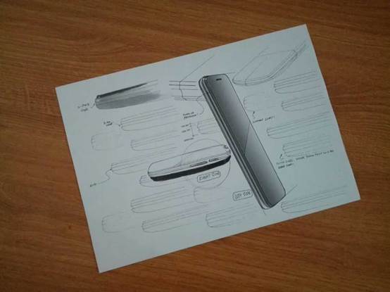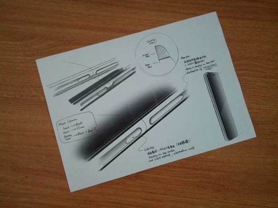 此外,手机背部上方有矩形虚实线的线条出现,基本可以断定是手机背部摄像头。从整体来看,外侧弧线圆润、线条流畅,类似珍珠般由大到小的渐变点纹理效果明显;虽然为设计草图,但仍旧渗透出较好的质感,因此推断荣耀4A的外边框很有可能是金属材质。