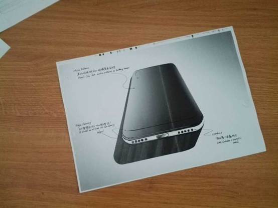 在这几张曝光图中可以看出外侧弧线圆润,线条流畅,并透出比较好的质感,推断很可能是金属材质,右边的音量键、电源键细节也是一览无遗;手机背部有矩形虚实线条,基本可以确定摄像头位置;正面平整光滑,而且两面都没有丝毫突起,美观程度较高。