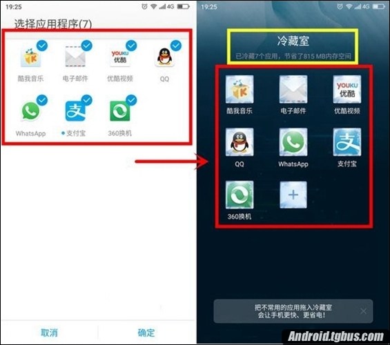2、点击加号之后我们就发现有很多可以加入冷藏室的应用,这时候我们发现可以多选,然后批量加入,这就是在桌面不能实现的了,加入后我们发现有一个提示“已冷藏7个应用,节省了815MB内存空间”,一目了然,很清晰。
