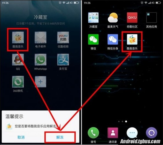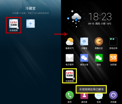 3、想要解除冷藏是我们只需要单击应用选择解冻即可,期间有个动画效果,挺有意思,我们发现应用又回到桌面了。
