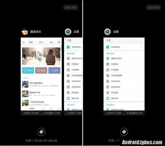4、然后我们来看下加入冷藏室前后的对比,左边是加入前,右边是加入后,这了后台我没有进行过任何清理,我们发现加入冷藏室后后台运行不见了,并且清除了内存,说明加入冷藏室的应用被冻结了。