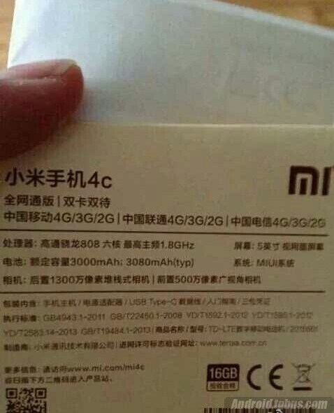 从工信部提前曝光的信息来看,小米4c配备的是5英寸1080p显示屏,搭载骁龙808六核处理器,内置2GB内存和16GB机身存储空间,提供一颗500万像素前置摄像头和一颗1300万像素后置摄像头,支持双卡双待全网通。