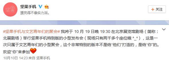 10月10日上午,坚果手机在其官方微博上公布消息,称10月19日晚上19:30坚果手机将会在北京展览馆剧场举行坚果手机特别版小型发布会,并宣称该发布会将会是”文艺青年们“的小型聚会,并得到了罗永浩转发。联想起10月12日早上10:00上架的 “告别宝丽来”“情怀”背壳,看来即将发布的这款坚果手机特别版将会与文艺青年方向颇有关联。