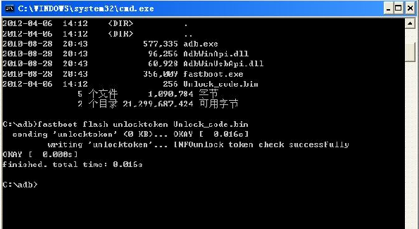 输入命令:fastboot flash unlocktoken Unlock_code.bin 回车,这时候手机会出现一把锁,此时你按音量键选择YES,按电源键确认后手机重启,然后进入手机系统设置一下就可以,因为手机恢了出厂设置。就算解锁完毕了!