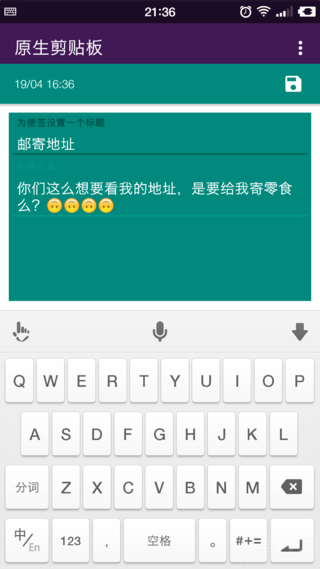 原生剪贴板能够做到的可远远不止记录手机复制内容而已。不知道大家还记不记得老罗在去年坚果发布会介绍 Smartisan OS 2.0 新功能的时候提到的一个「快捷短语」的小功能:在系统内任何文本输入界面长按即可呼出「快捷短语」按钮,点击按钮可在弹出的列表中选择预先输入的常用短语(节选自 Smartisan 2.0 正式版更新日志)。作为一个正在使用坚果手机的同学,我表示这个功能真是太好用了!像输入一些日常经常需要输入的长串文字比如说地址、邮箱账户、学号等等简直不要太方便!现在,只要你安装了原生剪贴板,非锤子系统的手机也可以使用这一个炒鸡好用的功能了!你可以点击左上角的加号按钮,新建一个条目,把你常用的一些文字加到剪贴板中,并在标题处写好标题,保存后点击一下上方的图钉按钮把这个条目固定住,下次要填写地址的时候只要点击一下剪贴板中的「地址」条目,你的地址就会自动复制下来了,你做要做的只是粘贴而已。在这里要提醒大家一下,千万别输入像什么密码和银行卡号这类东西,万一手机丢掉了,后果可是不堪设想~
