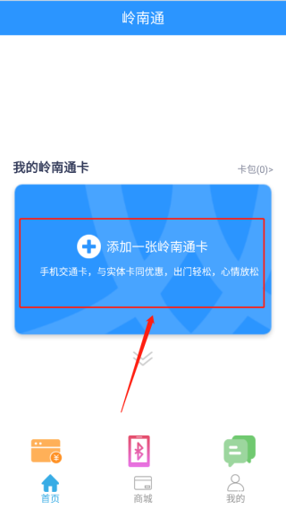 1、进入软件,点击首页的“添加一张岭南通卡”