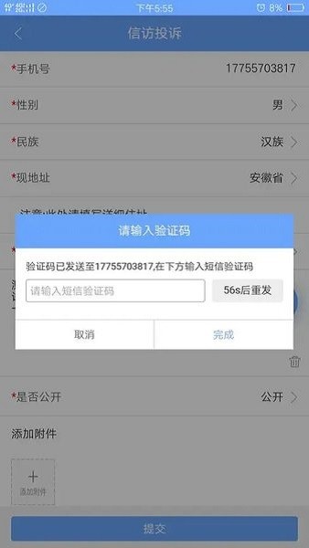 最后获取并输入验证码,点击“完成”,就投诉完成,并自动转入信访局受理平台。