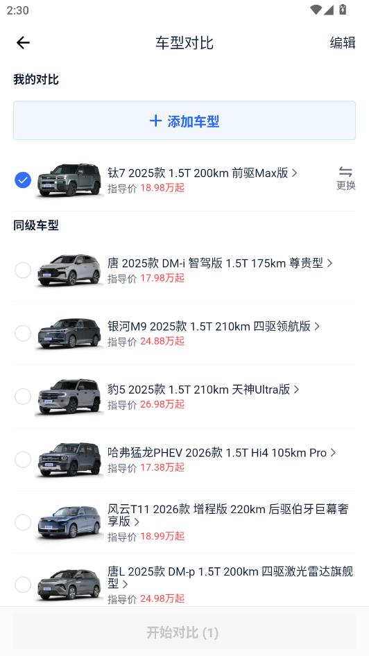 选择想要对比的车型点击开始对比即可。
