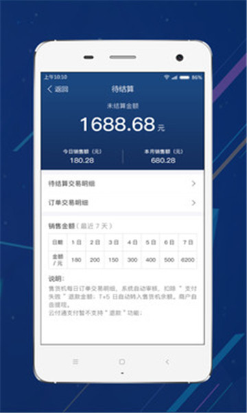 代理人商户通过本软件可实时查询代理设备的交易情况,对每台设备交易情况实时掌控,统计每天收益,对收益进行体现。