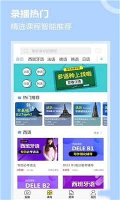 堂吉诃德学院app的课程涵盖西班牙语、日语、法语、韩语、德语等科目。各学科依据考试大纲和职业需求设计课程,根据学员学习计划提供视频、刷题、答疑、作业批改、推荐就业等服务。