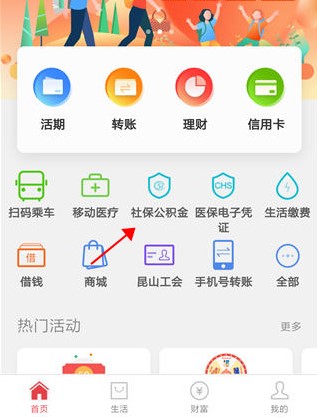 1、大家打开昆山农商银行APP之后就可以看到首页的社保公积金了;