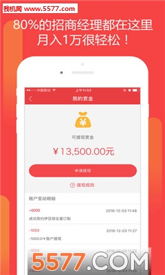 第四个功能是“挖佣金”、这也是渠道经理最最关心的功能模块了,因为它事关“钱包”。渠道经理的所有佣金与佣金明细都能在这里看到,并且能够快速提现至银行卡,方便、快建又安全。