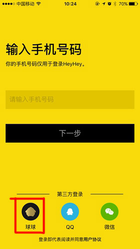 在登陆heyhey语音的时候可以用手机号码登陆,也可以点击下面的球球账号登陆。