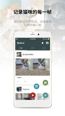 Catbook 是一个面向猫咪爱好者的轻博客APP,你可以在上面给自己的猫咪开一个博客,记录和分享猫咪的照片。也可以关注你喜欢的猫咪,和猫咪主人互动。