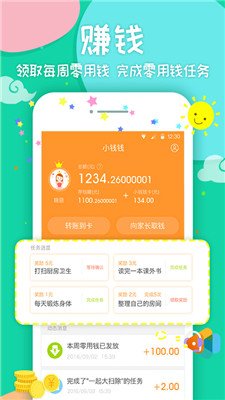 家长用APP给孩子发零用钱,每周定时定量给零用钱,孩子完成任务赚取零用钱奖励,支持孩子刷卡实时消费提醒、设定卡限额、一键锁卡挂失。