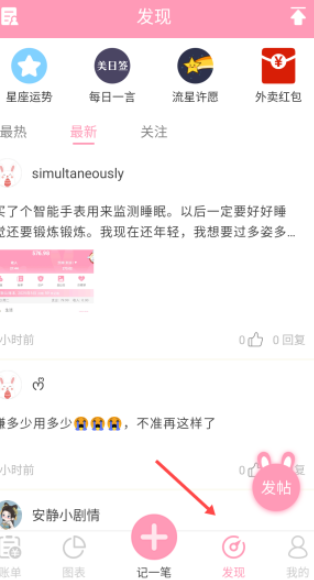 3、点击发现界面,含星座运势等功能,呈现用户动态,底部有账单等导航选项,右下角设发帖按钮方便互动。