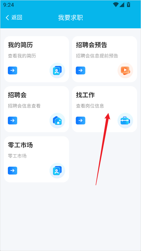 3、在页面中选择【找工作】,即可查看最新岗位招聘信息。