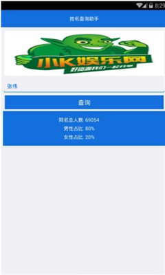 姓名数量查询app是一款专门为用户提供一个中国姓名数量查询手机软件,姓名数量查询app十分的小巧,随时随地可以帮助你查询数量,例如“李伟”、“张红”等名字,十分轻松就的就能帮你统计出数量。