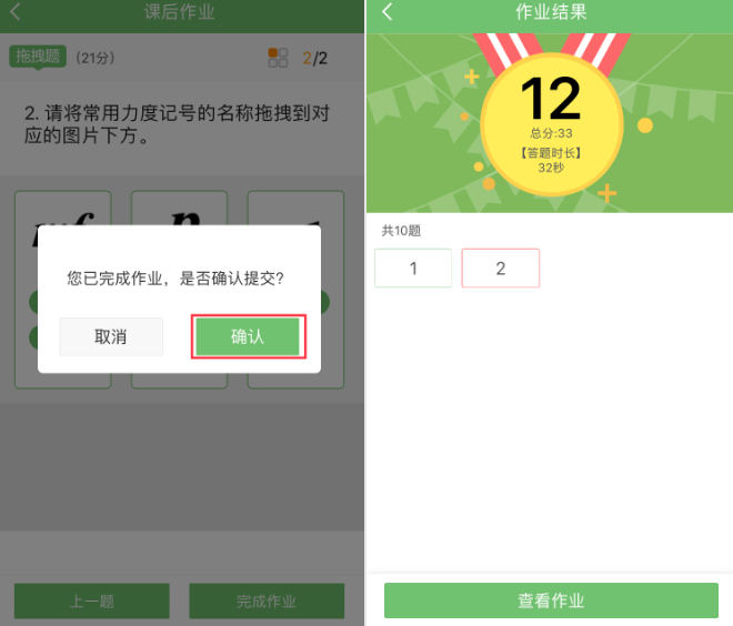 2.完成作业后,点击“确认”后可以查看完成作业的情况。