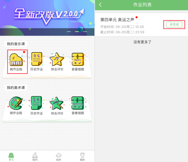 【校内】进入“音乐任务”、“美术任务”等,丰富多彩课前课后任务,翻转你的课堂,展示成果与才华,发掘你的潜力,同学老师一起来点评,让你成为同学中的小明星!