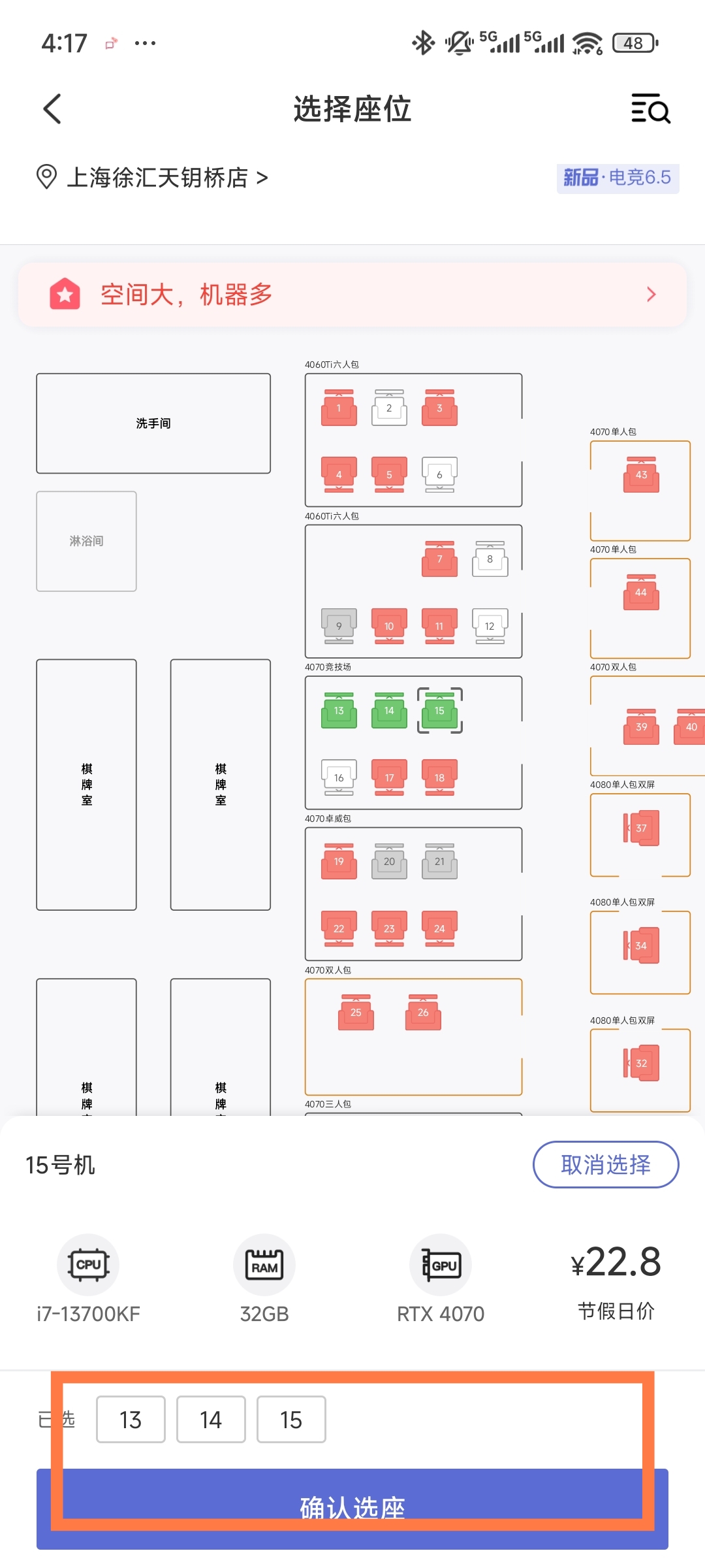 2、选择好位置后,点击确认选座