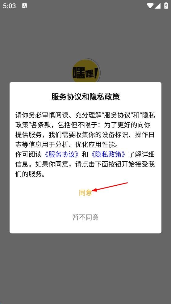 1、打开嘿嘿漫画,在服务协议和隐私政策界面,仔细阅读相关条款后,点击同意,进入APP主界面。