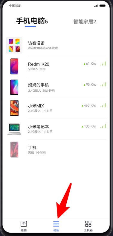2、在“设备”页面可实时查看所有连接设备及其网络状态,方便管理每台设备的连接情况。