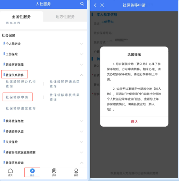02选择“服务”——“社会保障”——“社保关系转移”,点击“社保转移申请”,仔细阅读“温馨提示”,阅读完毕后点击“确认”按钮。