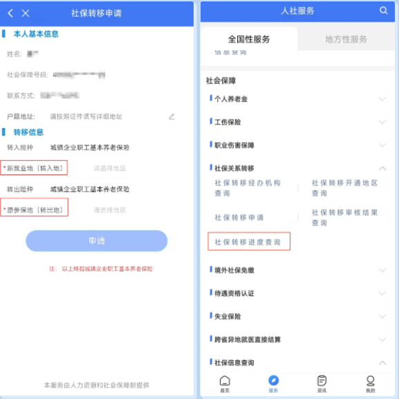 03按要求填写“新就业地(转入地)”和“原参保地(转出地)”,填写完成后,点击“申请”即可。在申请完成后,可以随时通过“社保转移进度查询”模块查询办理进度。
