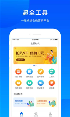 全民时代app是一款专门为从事微商工作的小伙伴打造的办公软件!这里有着超多便捷实用的办公工具,不论是找项目、找素材还是查快递记笔记都可以轻松解决,并且还可以无打扰清理死粉僵尸粉等,需要的小伙伴快来下载吧!